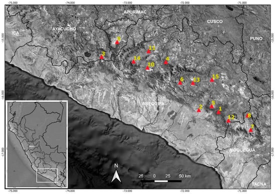 Distribution map of the volcanoes of the Arequipa Region, northwestern Moquegua Region and southwestern Ayacucho: 1: Misti, 2: Cerro Nicholson, 3: Sara-Sara, 4: Andahua-Orcopampa, 5: Chachani, 6: Huambo, 7: Huaynaputina, 8: Ubinas, 9: Cerro Auquihuato, 10: Coropuna, 11: Nevados Firura, 12: Pichu-Pichu, 13: Sabancaya, 14: Solimana, 15: Huarancante.