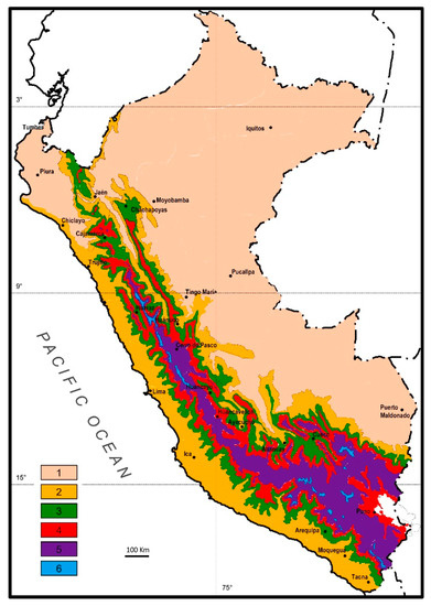 Bioclimatic belts in Peru according to Galán-de-Mera et al. (modified) [40]. 1: Infratropical, 2: Thermotropical, 3: Mesotropical, 4: Supratropical, 5: Orotropical, 6: Cryorotropical.