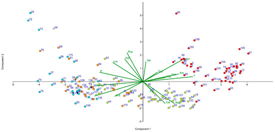 In the PCA (Figure 3), specimens are arranged along the axes according to altitude (H) (Component 1) and Thermicity Index (It) (Component 2). Precipitation trends higher towards the negative values of Component 2, while the Thermicity Index (It) trends higher towards the positive values of the x-axis. Thus, species located further to the right of the ordinate axis are found in the thermotropical bioclimatic belt, while those located further to the left are found in the supra- and orotropical belts. This means that the distances to volcanoes, combined with very low rainfall and a higher thermicity index (It) and, in turn, with Arenosols (Are), Gypsisols (Gyp), Solonchaks (Sch) and Leptosols (Lep) denote the species that are concentrated on the thermotropical coastal belt. These species include Lomanthus icaensis (57), and L. mollendoensis (58,61,62), Ophryosporus bipinnatifidus (89), Polyachyrus annuus (102,103,104), and Senecio calcicola (109,110,111).