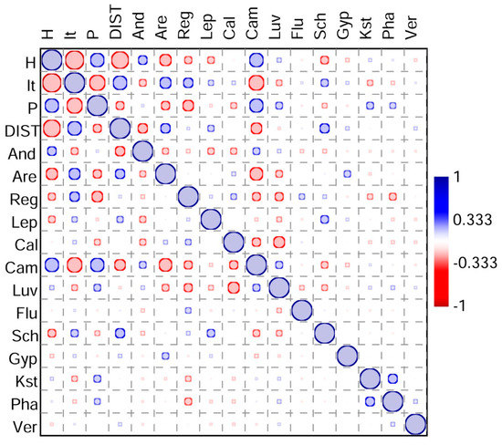 Supporting the PCA results, the correlation matrix (Figure 4) shows the correlation between the different PCA variables, between positive values if there is at least some correlation, or negative values if the correlation is negative. H (altitude) and DIST (distance to volcanoes) are negatively correlated, since at lower altitudes in the coastal desert, the distance to volcanoes is greater. However, P (precipitation) has a positive correlation with altitude because the highest precipitation values are at high altitudes in the Arequipa Region. Similarly, Are (Arenosols) have a negative correlation with altitude and precipitation, as most of the arenosols are on the coast. Kst (Kastanozems) and Pha (Phaeozems) have a positive correlation with precipitation as they are located in the most humid localities of the Andes. Andosols have a positive correlation with altitude as they are mainly found in the vicinity of volcanic cones, which are areas of higher bioclimatic levels, where the value of the thermicity index (It) is lower.