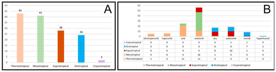 Distribution of localities with endemic and semi-endemic Asteraceae in the Arequipa Region among.bioclimatic belts (A) and ombrotypes (B).
