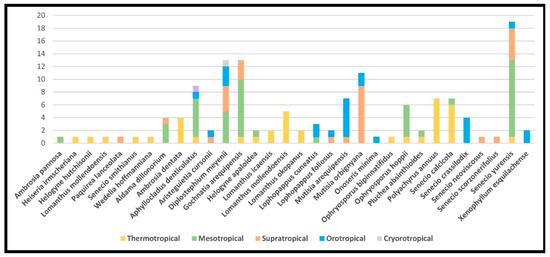 The number of times that a species is found within a bioclimatic belt indicates whether or not it is a bioindicator (Figure 6). In contrast to species such as Ambrosia pannosa (mesotropical), Heiseria irmscheriana (thermotropical), Helogyne hutchisonii (thermotropical), Lomanthus mollendoensis (thermotropical), Paquirea lanceolata (supratropical) or Senecio smithianus (thermotropical), there are others with a wider dispersion, such as Senecio yurensis (from thermo- to orotropical), Diplostephium meyenii (from meso- to cryorotropical) or Gochnatia arequipensis (from thermo- to supratropical). Thermotropical bioindicators are Ambrosia dentata, Heiseria irmscheriana, Helogyne hutchisonii, Lomanthus icaensis, L. mollendoensis, L. okopanus, Ophryosporus bipinnatifidus, Polyachyrus annuus, Senecio smithianus, and Wedelia hoffmanniana; however, only one mesotropical bioindicator, Ambrosia pannosa, was found. The supratropical ones are Paquirea lanceolata, Senecio neoviscosus, and S. scorzonerifolius. On the orotropical belt only Onoseris minima, Senecio crassilodix and Werneria esquilachensis are bioindicators. There are no bioindicators on the cryorotropical belt among the endemisms and semi-endemisms of the Arequipa Region.