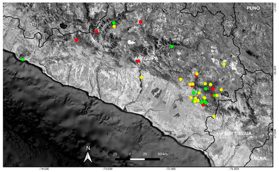 Distribution of Diplostephium meyenii (red dots), Gochnatia arequipensis (green dots), and Senecio yurensis (yellow dots) in Arequipa Region.