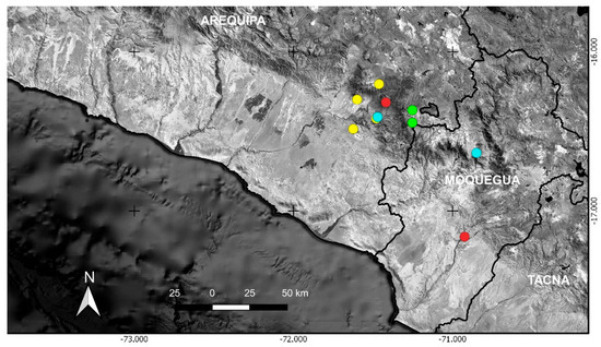 Distribution of Aldama dilloniorum (yellow dots), Onoseris minima (red dots), Senecio neoviscosus (light blue dots), and Werneria esquilachensis (green dots) in the surroundings of the Chachani, Misti, and Pichu-Pichu volcanoes, including localities from Moquegua.