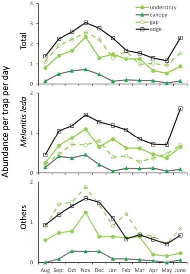 We described the partitioning of an insect community into the four main forest habitats (understory, canopy, treefall gaps, and forest edge), and sampled during all seasons of a monsoon climate. Information on such insect community structure parameters for tropical forest regions that are isolated from major rain forest blocks are scarce []. By trapping fruit-feeding butterflies using standard methodology, we facilitated comparison with results of similar studies carried out in other tropical forests. In particular, we found a fair abundance but a low number of fruit-feeding butterfly species, and no canopy specialists. Temporal dynamics suggested continuous breeding with synchronous abundance fluctuations, peaking near the end of the wet season. The present study is also in conformity with the findings of other studies in tropical forests, where greater canopy openness and light intensity resulted in higher butterfly diversity [,].