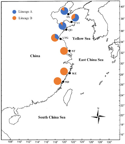 The results of the COI and the 16S sequence analysis were consistent. Lineage A and Lineage B were sympatric and regularly distributed across DL, YT, QD, and LYG stocks, while Lineage A was only distributed across DL, YT, QD, and LYG localities, and Lineage B was distributed across all the seven localities (Figure 1, Figure 2 and Figure 3).