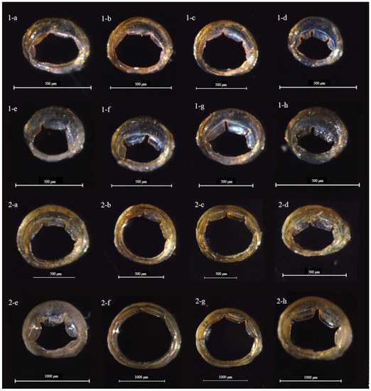 Sucker rings of L. (N.) beka. (Note: 1: Lineage A; 2: Lineage B; a: Arm I sucker ring (♀); b: Arm II sucker ring (♀); c: Arm III sucker ring (♀); d: Arm Ⅳ sucker ring (♀); e: Arm I sucker ring (♂); f: Arm II sucker ring (♂); g: Arm III sucker ring (♂); and h: Arm Ⅳ sucker ring (♂)).