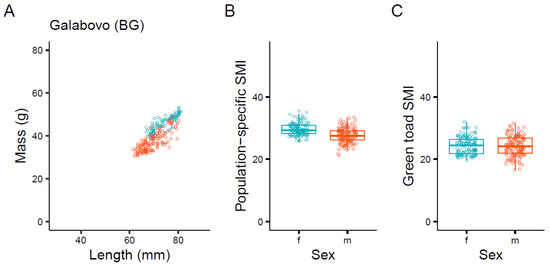 Mass versus lengths of toads in Galabovo (BG) (A) and the SMI of females and males using the population-specific coefficient (B) and the green toad coefficient (C). Boxplots show median (bold line), the 25th and 75th percentiles (lower and upper end of the box), as well as the 0% and 100% percentiles (lower and upper end of whiskers, excluding outliers). The reference length for SMI calculations was 60 mm and coefficient b was 2.042 (population-specific SMI) and 3 (green toad SMI).