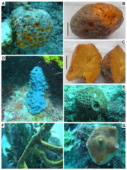Sponge specimens harboring nematode populations: (A) Cinachryrella sp. (specimen PA13 in situ); (B) Cinachryrella sp. (specimen PA21 delivered on board); (C) Cinachryrella sp. (specimen PA21 cut); (D) Aiolochroia crassa (specimen PA2 in situ); (E) Verongula rigida (specimen PA20 in situ); (F) Aplysina fulva (PA22 in situ); (G) Unidentified demospongian (specimen PA8 in situ). (B,C)—scale 3 cm.