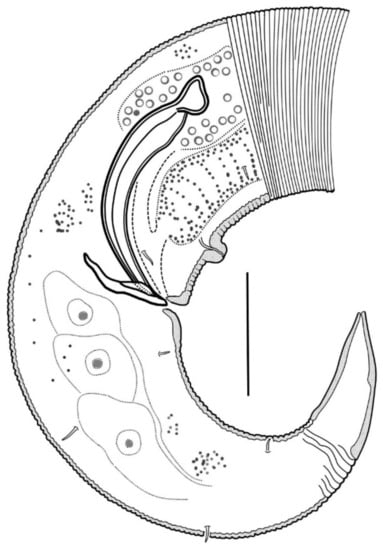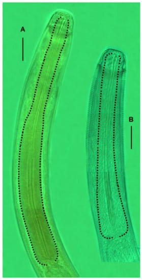 In conclusion, the mature individuals of both genders are clearly separated into two morphotypes. The best discriminant character is the pharynx length for both sexes, with 280 μm as the critical value (the gap for males is even bigger, from 180 to 280 μm). The second character is the body length for males (critical value 1400 μm), then index “b” for females (critical value 6.5). Each of these measurements discriminates specimens well, even taken alone. The differences are summarized further in “Differential diagnosis of Acanthopharynx parva sp. n.” (see Section 3.3).