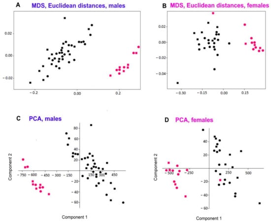 The results of Two-way Analysis of Similarities (ANOSIM) for males (n = 53) and females (n = 39). Samples and groups were the same as in Figure 2. The test statistics R (tend to 1 as differences increase) and significance p were calculated using PAST v.4.10.