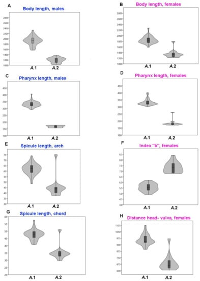 The examples of the solitary characters analyses of the two assemblages of males (left) and females (right) from samples PA13 and PA21 belonging to groups Acanthopharynx 1 (A.1) and Acanthopharynx 2 (A.2): (A) Body length, males; (B) Body length, females; (C) Pharynx length, males; (D) Pharynx length, females; (E) Spicule length, arch; (F) Index “b”, females; (G) Spicule length, chord; (H) Distance head—vulva, females.
