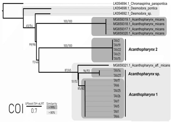 As for individuals TAV14 and TAV27, prior to DNA extraction, they were examined under a light microscope and designated as Acantopharynx 1. Since no particular features in their morphology and morphometry were revealed, the status of these two specimens remains unresolved.
