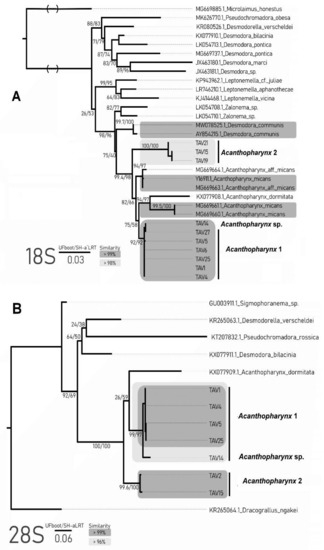 The obtained sequences for 28S were shorter than 18S and comprised 666 to 692 bp for Acanthopharynx 1. The length of Acanthopharynx 2 sequences was 669 bp and 667 bp, with 98.1% similarity between them. The similarity within the first species varied from 96.1% to 99.9%, which is explained by the higher dissimilarity of one sample (TAV14). Without this individual, the similarities between other specimens were more than 99%. The 28S alignment was 655 bp long, with 332 variable sites, of which 200 were parsimony informative. The phylogenetic reconstruction showed that Acanthopharynx species formed one clade sister to other genera (Figure 6B). Two well-supported clades corresponded to morphospecies Acanthopharynx 1 and 2. The third one (TAV14) belongs to the Acanthopharynx 1 clade but is distinguished from its other representatives. The ABGD and mPTP analyses support the presence of three clades of Acanthopharynx apart from the Genbank data.