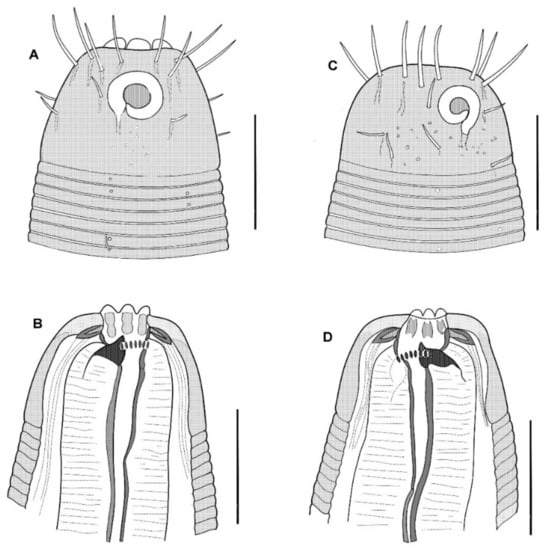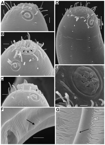 - Blaxter, M.L.; De Ley, P.; Garey, J.R.; Liu, L.X.; Scheldeman, P.; Vierstraete, A.; Vanfleteren, J.R.; Mackey, L.Y.; Dorris, M.; Frisse, L.M.; et al. A molecular evolutionary framework for the phylum Nematoda. Nature 1998, 392, 71–75. [Google Scholar] [CrossRef]