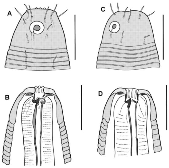 Pharynx outline (dash lined) in two varieties initially recognized: (A) Acanthopharynx 1, pharynx consists of two distinct parts, anterior narrow and posterior wide; (B) Acanthopharynx 2, pharynx elongate conoid. Scale bars 20 μm.
