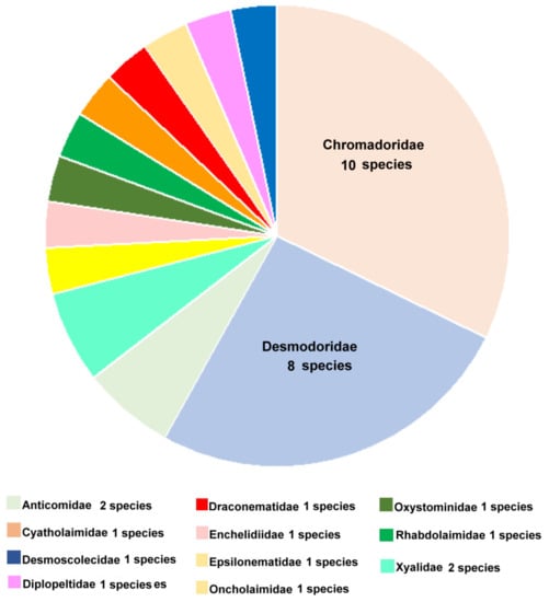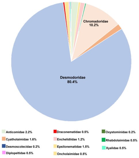 The comparison of the sponge nematode population with nematode communities typical of shallow carbonate coarse sediments, e.g., Refs. [,,] reveals some features of nematode communities associated with demosponges: