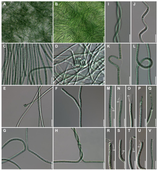 - Malone, C.F.D.S.; Rigonato, J.; Laughinghouse IV, H.D.; Schmidt, E.C.; Bouzon, Z.L.; Wilmotte, A.; Fiore, M.F.; Sant’Anna, C.L. Cephalothrix gen. nov. (Cyanobacteria): Towards an intraspecific phylogenetic evaluation by multilocus analyses. Int. J. Syst. Evol. Microbiol. 2015, 65, 2993–3007. [Google Scholar] [CrossRef]