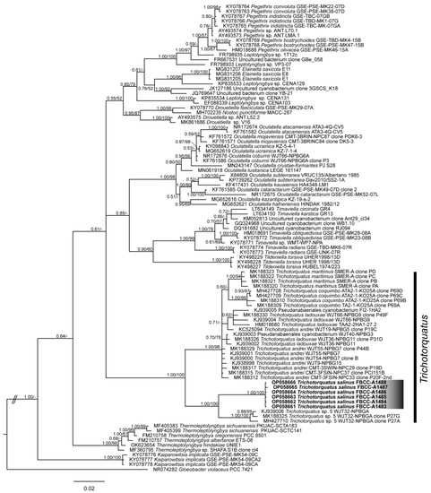 - Mai, T.; Johansen, J.R.; Pietrasiak, N.; Bohunická, M.; Martin, M.P. Revision of the Synechococcales (Cyanobacteria) through recognition of four families including Oculatellaceae fam. nov. and Trichocoleaceae fam. nov. and six new genera containing 14 species. Phytotaxa 2018, 365, 1–59. [Google Scholar] [CrossRef]