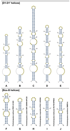 - Lowe, T.M.; Chan, P.P. tRNAscan-SE On-line: Integrating search and context for analysis of transfer RNA genes. Nucleic Acids Res. 2016, 44, W54–W57. [Google Scholar] [CrossRef]