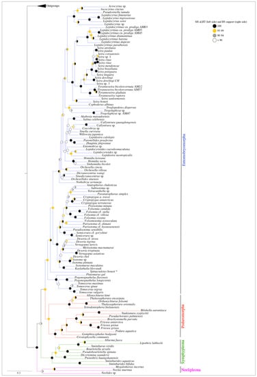 - Misof, B.; Liu, S.; Meusemann, K.; Peters, R.S.; Donath, A.; Mayer, C.; Frandsen, P.B.; Ware, J.; Flouri, T.; Beutel, R.G.; et al. Phylogenomics resolves the timing and pattern of insect evolution. Science 2014, 346, 763–767. [Google Scholar] [CrossRef]