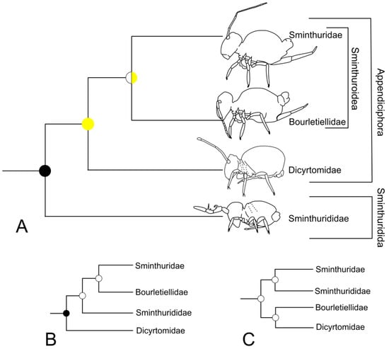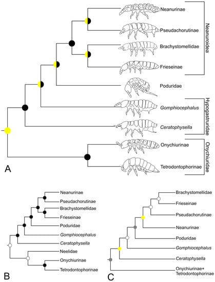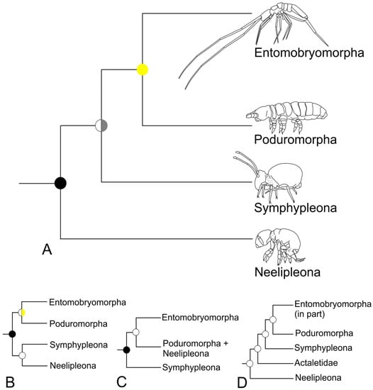 - D’Haese, C.A. Morphological appraisal of Collembola phylogeny with special emphasis on Poduromorpha and a test of the aquatic origin hypothesis. Zool. Scr. 2003, 32, 563–586. [Google Scholar] [CrossRef]
