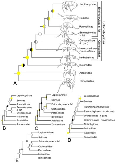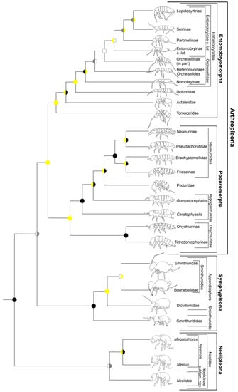 - Yu, D.; Ding, Y.; Tihelka, E.; Cai, C.; Hu, F.; Liu, M.; Zhang, F. Phylogenomics of Elongate-Bodied Springtails Reveals Independent Transitions from Aboveground to Belowground Habitats in Deep Time. Syst. Biol. 2022, 71, 1023–1031. [Google Scholar] [CrossRef] [PubMed]