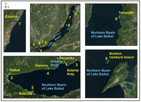 - Timoshkin, O.A.; Samsonov, D.P.; Yamamuro, M.; Moore, M.V.; Belykh, O.I.; Malnik, V.V.; Sakirko, M.V.; Shirokaya, A.A.; Bondarenko, N.A.; Domysheva, V.M.; et al. Rapid ecological change in the coastal zone of Lake Baikal (East Siberia): Is the site of the world’s greatest freshwater biodiversity in danger? J. Great Lakes Res. 2006, 42, 487–497. [Google Scholar] [CrossRef]
