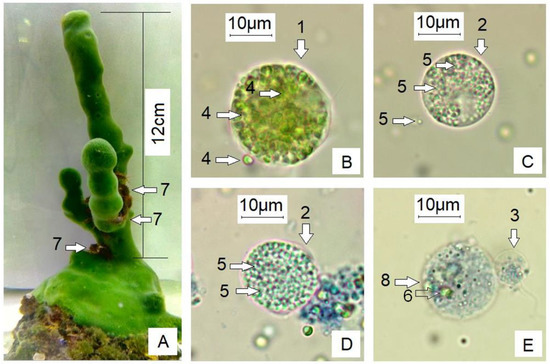 Photo of Lubomirskia Baikalensis (class Demospongiae, order Spongillida, family Lubomirskiidae) in aquarium and the sponge dominant cell light microscope images. (A)–underwater image of epilithic sponge with exosymbionts (7) Brandtia parasitica (class malacostraca, order Amphipoda, family Acanthogammaridae); (B)–healthy sponge amoebocytes of the first type (SA1-cells) (1) and its eukaryotic endosymbionts Chlorella sp. (4); (C)—healthy amoebocytes of the second type (SA2-cells) (2) and its prokaryotic endosymbionts; (5); (D)–healthy amoebocytes (SA2-cells) (2) and its prokaryotic endosymbionts (5), stained with methylene blue; (E)–amoebocytes containing symbiont assemblage (SA3-cells) (8) including green algae (6) and a cell with flagellum (SA4-cell) containing prokaryotic symbionts (3).
