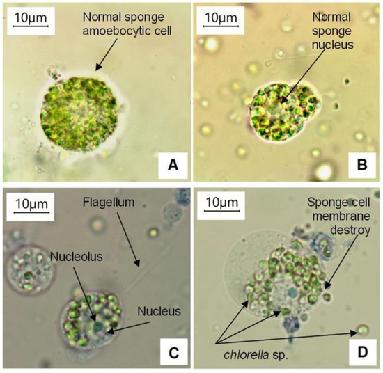 It was already noted that unicellular symbiotic microorganisms are located within the organelles viz. vacuoles of mesenchymal cells (archeocytes) from freshwater sponges [45] or located directly in sponge amoebocyte cytosol [21]. In this study, we classified Lubomirskia baikalensis (Figure 2A) amoebocytes into four types depending on the domain of endosymbiotic microorganisms inside. Microalgae of two domains of Chlorophyta and Cyanophyta were easily seen with a light microscope and were localized within colorless amoebocytes (Figure 2B–E). The amoebocytes containing eukaryotic symbiotic green microalgae Chlorella sp. are found to be the largest and dominant cells of the investigated sponges (Figure 2A). The list below illustrates a description of different amoebocytic cell types.