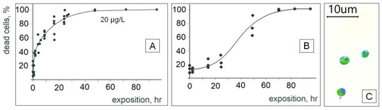 Cell death curves. (A)–Lubomirskia baikalensis dead SA1-cell percentages increase in dependence on duration of 20 μg L−1 linear alkylbenzene sulfonates exposure; (B)–Chlorella sp. dead cell percentages increase in dependence on duration of 20 μg L−1 LAS exposure; (C)–dead symbiotic Chlorella sp. cells stained with methylene blue for 72 h exposure.