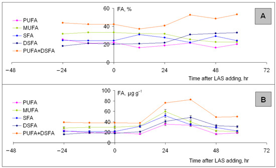 Significant changes in FA composition within 24–48 h after LAS addition (Figure 5A, right) into aquarian water were fixed. Percentages of SFA, MUFA, and the sum of PUFA and DSFA ranged within 22–30, 23–32, and 37–53, respectively (Figure 5A).