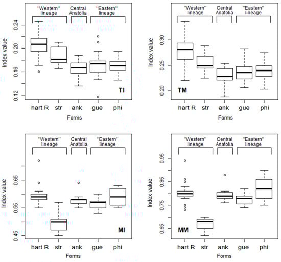 The analysis of morpho-ecological indices showed the significance of the differences between the eastern and western cluster (p < 0.001). The smallest TI and TM indices were noted in subspecies Phi and Gue (TI 0.169 and TM 0.237; 0.171 and 0.237, respectively) and the highest indices were noted in the forms Str and Har R (TI 0.186 and TM 0.254; 0.204 and 0.277, respectively; Figure 2). Subspecies Ank from Central Anatolia (TI 0.165 and TM 0.229) was not different in any index from the eastern cluster. Meanwhile, it differed significantly from the western cluster (p < 0.001). Marked differences in four indices were found between the two European forms in four indices (p < 0.001) (Figure 2). Differences in the MI index and in the MM index proved to be smaller, but pairwise comparisons detected statistically significant differences. Each form of voles was found to have specific morpho-ecological indices, pointing to significant changes affecting all parts of the jaw.