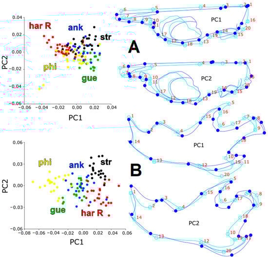 Scatter plots of the PCA (on the left) and positive directional shape changes of PC1 and PC2 (on the right) of the cranial (A) and mandibular (B) datasets among five vole forms in the “guentheri” group. Blue dots indicate landmarks after shape deformation; red numbers indicate landmark numbers; the scale factor for deformation visualization for the cranium is 0.13, and for the mandible, it is 0.16.
