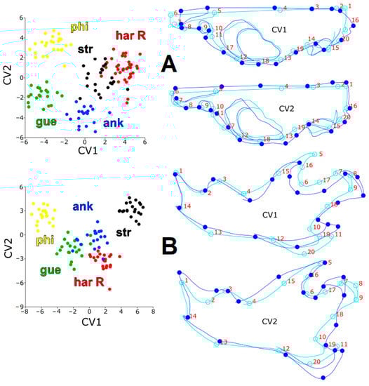 Scatter plots of the CVA (on the left) and positive directional shape changes of CV1 and CV2 (on the right) in the cranial (A) and mandibular (B) datasets among five vole forms in the “guentheri” group. Blue dots indicate landmarks after shape deformation; red numbers indicate landmark numbers; the scale factor for deformation visualization: 30.0.