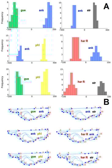 The results of the DFA also showed the strong effect size (p < 0.001) of the shape differences between most of examined datasets except for Ank vs. Gue in their cranial deformation (parametric p = 0.2002) and Ank vs. Gue (parametric p = 0.6723) and Ank vs. Phi (parametric p = 0.0774; permutation p = 0.0770) in mandible variation (Table 7). The DFA detected no statistically significant difference in shape between males and females for both cranial and mandibular projections (high permutation p values of the Procrustes distance; p > 0.05; Table 8).