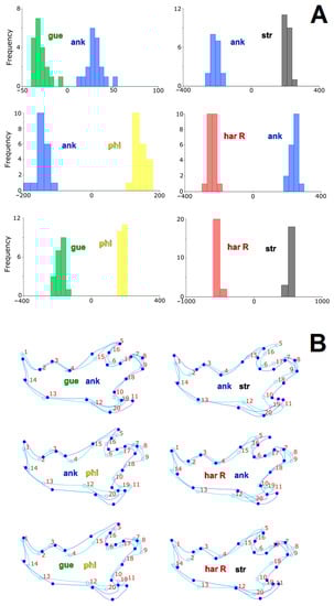 Shape peculiarities in vole forms were well separated along the first axis of the scatter plot in the CVA (Figure 4). In the cranial dataset, CV1 explained 52.68% of the total variance, and in the mandibular dataset, CV1 explained 55.6% of the total variance in shape in all of the examined forms. The first two CV axes together explained 79.1% of the cranium shape variance and 80.3% of the mandible shape variance. The most significant shape changes of the positive and negative directional deformation according to cranium CV1 were the slenderer and more elongated rostrum of M. h. philistinus and M. g. guentheri along CV1, whereas M. hartingi voles had shorter and blunter premaxillae and nasal bones. According to CV2, M. h. philistinus, M. h. strandzensis, and M. hartingi from the Rhodopes had a broader cranium dorsally with the coronoid process developed further from the medial line and the parietal and occipital bones developed broader as compared to Ank and Gue showing the oppositely directed deformation of the cranial shape (see Figure 4A). As for the mandible specimens, M. hartingi voles (Har and Str) are characterized by a narrower and slenderer mandibular condyle as compared to the other voles, judging by CV1. Furthermore, Phi, Ank, and Gue showed thicker and wider mandibles making incisura mandibulare narrower and making the coronoid process (LM 5) stand proportionally closer to the condyle (LM 7) (Figure 4B). Positive and negative directional shape changes between specific forms in the DFA were more or less similar to the patterns seen in the CVA (Figure 5 and Figure 6). Additionally, according to the DFA graphical visualization, for all the parameters, the values of shape deformation did not overlap (Figure 6), thereby pointing to form-specific and significantly different shape deformations. The mandible data also had lower interspecific shape variation as compared to the cranial data (Figure 5).