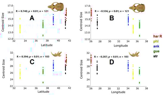 Correlations between centroid size–related cranial GM landmark data (A,B) or mandibular GM landmark data (C,D) and the geographical latitude and longitude of sampling.