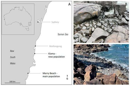 Several boulder beaches on the NSW south coast were surveyed for Smeagol: Bass Point, Shellharbour (34°35′55.27″ S 150°53′56.46″ E); Little Blowhole Beach, Kiama (34°41′16.22″ S 150°51′59.33″ E); Loves Bay, Kiama (34°41′51.09″ S 150°51′44.01″ E); Storm Bay, Kiama (34°40′19.92″ S, 150°51′30.95″ E); O’Hara Head, Kioloa (35°33′36.33″ S 150°23′39.18″ E); Pretty Beach, Kioloa (35°34′16.01″ S 150°22′17.42″ E); Pebbly Beach, Kioloa (35°35′44.16″ S 150°19′45.03″ E); Shelly Beach, Kioloa (35°32′43.24″ S 150°22′55.03″ E), and Merry Beach, Kioloa (35°33′41.47″ S, 150°22′44.57″ E). Of these, only Merry Beach and Storm Bay (Figure 1A,B) were found to shelter Smeagol.