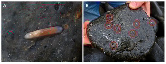 Smeagol hilaris at Merry Beach, NSW, 7 April 2022: (A) adult specimen; (B) eight individuals on a single cobble (circled in red). Photos: Tom R. Davis.
