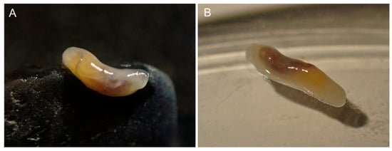 Storm Bay at Kiama (Figure 1C) is a narrow, steeply sloping boulder beach, situated between two rocky headlands surrounded by parkland in close proximity to the town centre. On 15 April 2022, a total of 31 individuals were observed at Storm Bay, Kiama, with three specimens collected (Figure 3A,B). All animals were found in the north-eastern part of the beach within an area 5.3 × 22.5 m (119.25 m2) and were restricted to 0.78 to 1.95 m above mean sea level in the beach profile (above the vertical distribution limit of the shelled gastropod Hinea braziliana (Lamarck, 1822)). The total number of individuals among the three quadrats used for density estimates was 13; thus, there is an estimated population of 515 individuals across the suitable habitat area. As for Merry Beach, Smeagol were only found on the under surface of cobbles and boulders within coarse gravel.