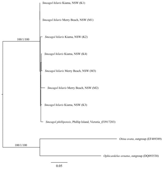 Molecular phylogeny of Smeagol hilaris from Merry Beach and Kiama, NSW, rooted with Ophicardelus ornatus and Otina ovata. The topology and branch lengths come from the maximum likelihood (ML) analysis of the COI sequences. Branch support values are approximate Bayes values (left), ML bootstrap (centre), and SH-aLRT support (right).