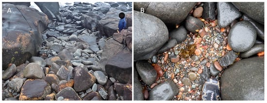 Smeagol habitat at Storm Bay, Kiama, NSW. (A) Greywacke boulder and cobble beach; (B) algal wrack at the neap high tide line (Smeagol were found under rocks beneath wrack material). Photos: Matt J. Nimbs.