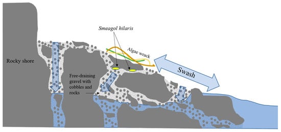 Smeagol hilaris habitat conceptual diagram. Animals are found beneath cobbles and rocks embedded in the upper 20–30 cm layer of gravel in freely-draining steep rock and boulder beaches at the neap high tide mark where algal wrack is deposited by swash.