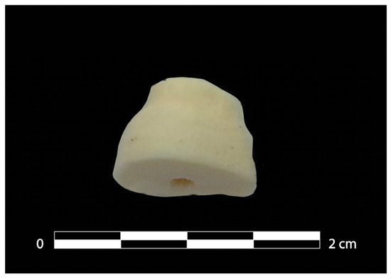 The sampling of the material necessary for DNA extraction was performed in a room of the Doderlein Museum, following strict criteria for decontamination [31]. As ancient DNA analysis is a destructive technique, the sampling was carried out to maximize the yield of DNA, but at the same time to minimize the visual impact of the sampled area. We decided to cut the apex part of the root of a tooth (Figure 2), which, once re-inserted into the alveolus, would not create aesthetic damage for exhibition. A tooth root was chosen as previous studies demonstrated that teeth are an optimal source for the retrieval of endogenous DNA [32,33]. Thus, for exhibition in museums, but also to preserve the specimen for future research, the choice of sampling area is very important, in order to both avoid/minimize external damage to the sample while not frustrating efforts at genotyping.