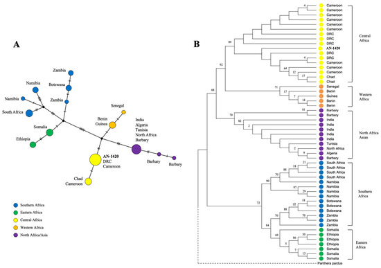 Phylogenetic analyses of the lion data based on the alignment created for this study. (A) Median Joining network for the alignment of the cytb haplotypes. (B) Phylogenetic tree reconstruction with the Maximum Likelihood method. Sample AN-1420 is placed in the Central African clade.