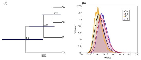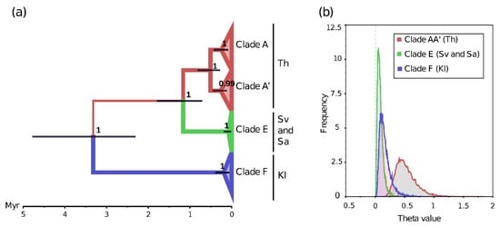 Divergence of RADseq genotypes of Crangonyx islandicus from the four sampling locations. (a) Maximum clade credibility tree (MCCT) and (b) posterior distribution of theta (θ = Ne*µ) parameters inferred by SNAPP [73] according to the Bayes Factor Delineation’s (BFD* [75,76]) best scenario for the four populations using 88 unlinked bi-allelic SNPs dataset (C3SNPr). Node number on the MCCT displays the posterior probability of the node, and the dark blue node bar indicates the 95% HPD interval of the node age. Th: Lake Thingvallavatn, Sv: Lake Svartárvatn, Kl: Klapparós, Sa: Sandur.