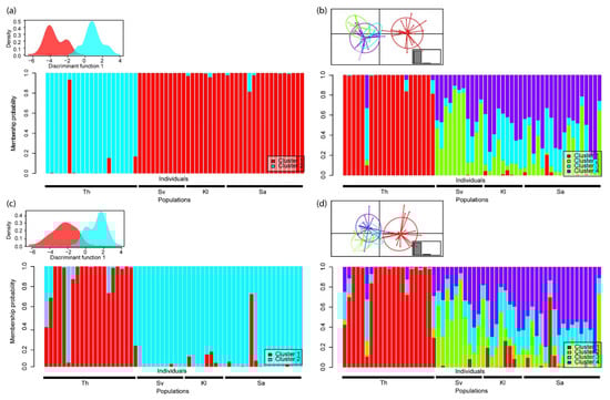 Discriminant analysis of principal components (DAPC) of RADseq data of four sampling locations of Crangonyx islandicus. The analysis is based on haplotypes, indels as missing data and with a minimum coverage of three (C3Hmiss dataset). The plots in (a,b) display the results of the C3Hmiss dataset before removing the loci in low frequency (n = 103) and after (n = 71): (c,d). The plots in (a,c) display the results of the optimal number of clusters inferred by a sequential K-means approach according to BIC criteria. The plots in (b,d) display the results of four sampling locations used as a priori number of clusters. The scatter plot of the DAPC is displayed as small plots and presents the main discriminants axis (1 axis for (a,c), and 2 axes for (b,d)), the ellipses represent the inertia of the clusters and the dots represent individuals. The barplots show the assignment probability of each individual to the different clusters. Th: Lake Thingvallavatn, Sv: Lake Svartárvatn, Kl: Klapparós, Sa: Sandur.