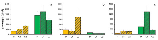 No differences in the total biomass of E. amentacea between P and Cs were detected at CIC (Table 2). The total biomass of E. amentacea inconsistently varied among sites and between sampling times (significant Ti × Si interaction, Table 3). However, as for PFN, a general increase in biomass can be observed in T2 (Figure 4a).