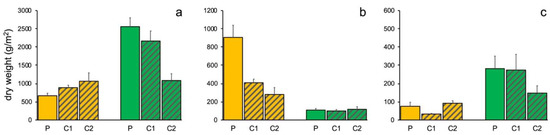 The total biomass of E. amentacea did not differ between P and Cs at PFN (Table 1). Visual inspection of the graph in Figure 2a suggested higher biomass of E. amentacea in T2, although ANOVA did not detect significant temporal variations (Table 1).